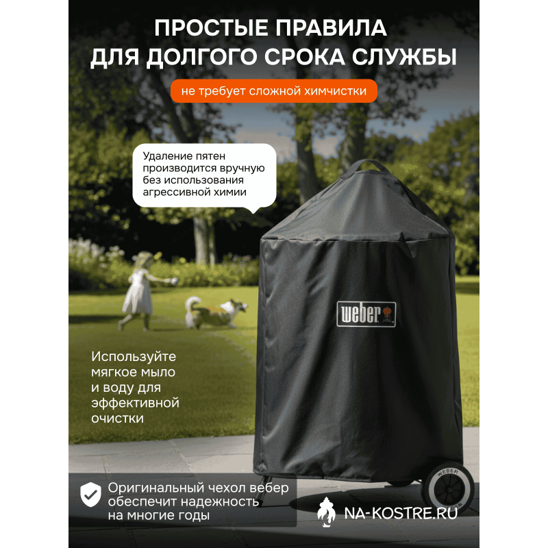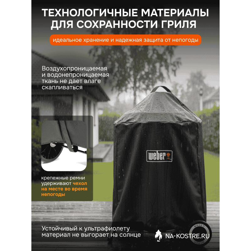 Не беспокойтесь о проливном дожде, холодном снеге или палящем солнце. Легкий и прочный чехол для гриля Premium легко надевается и снимается. Крепежные ремни предотвращают его сдувание ветром на соседний участок, а водонепроницаемый материал помогает сохранить поверхность чистой и гладкой.