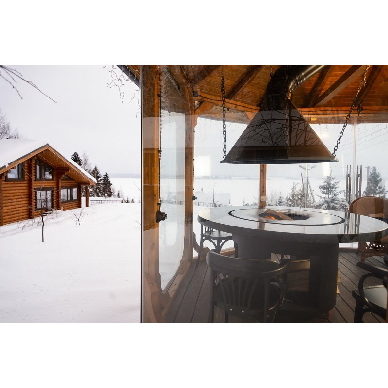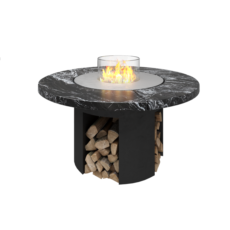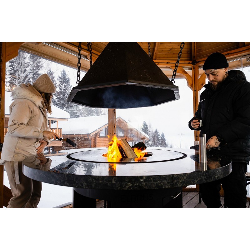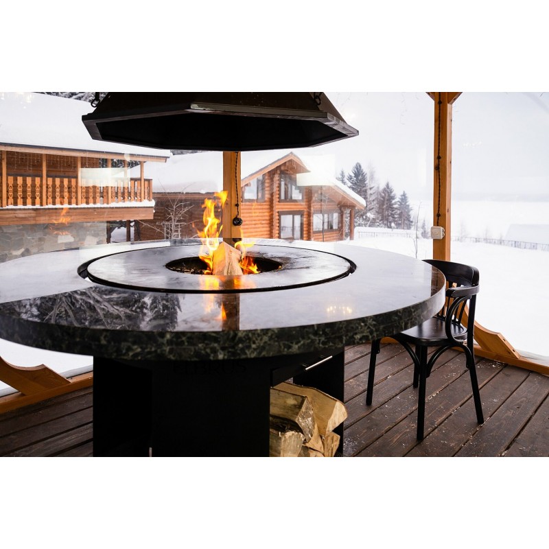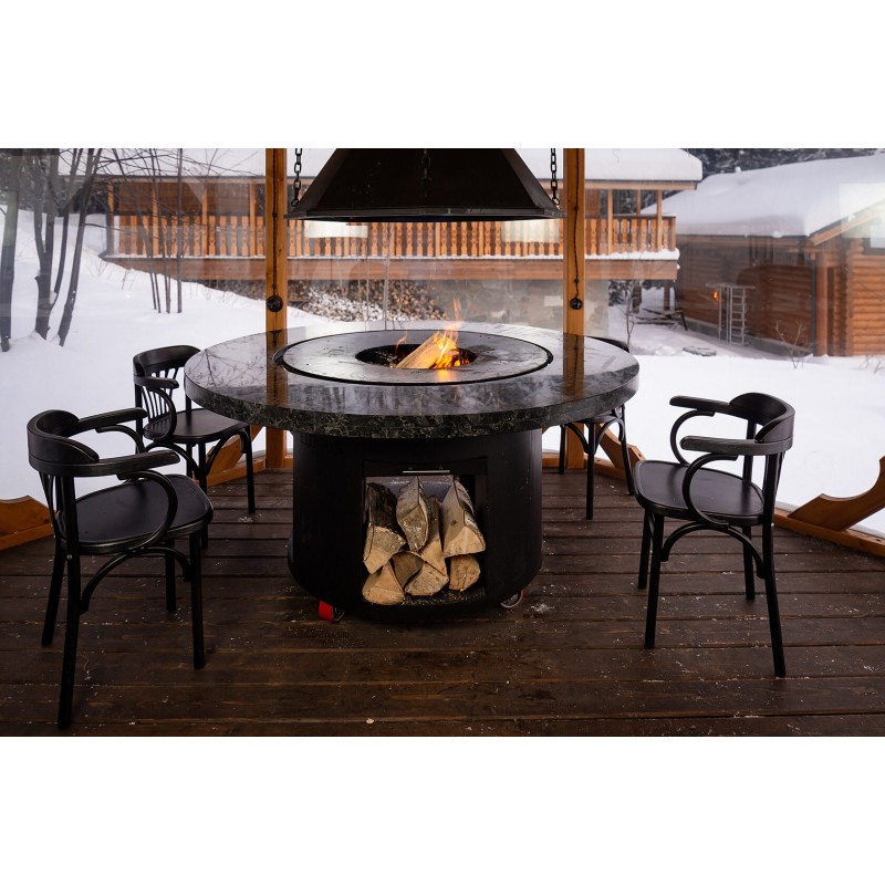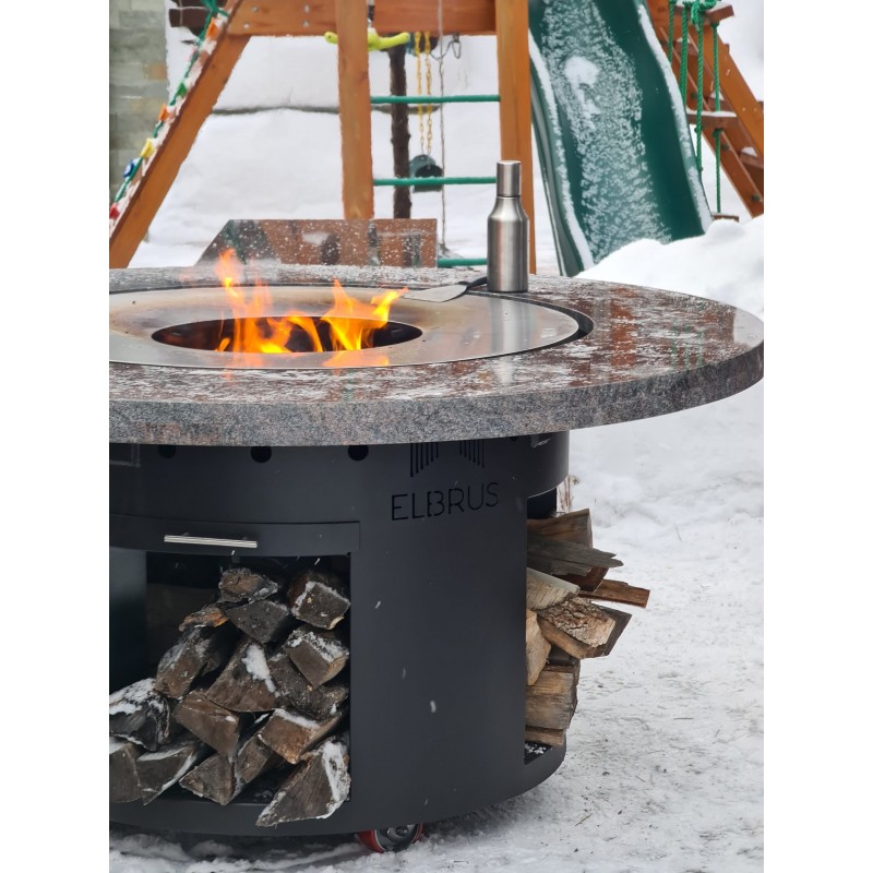 Имеет отсеки для хранения дров, каменную столешницу (гранит), а также жарочную поверхность, систему удаления золы и колосник.