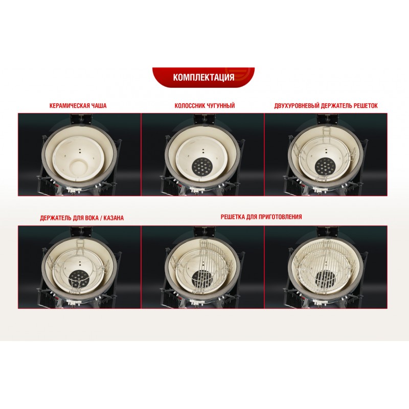 Гриль оснащен трехуровневой системой решеток. Верхняя решетка выполняет функцию гриля, средняя служит подставкой для вока, казана или камня для пиццы, нижняя - керамический жароотсекатель, который обеспечивает равномерное распределение тепла.