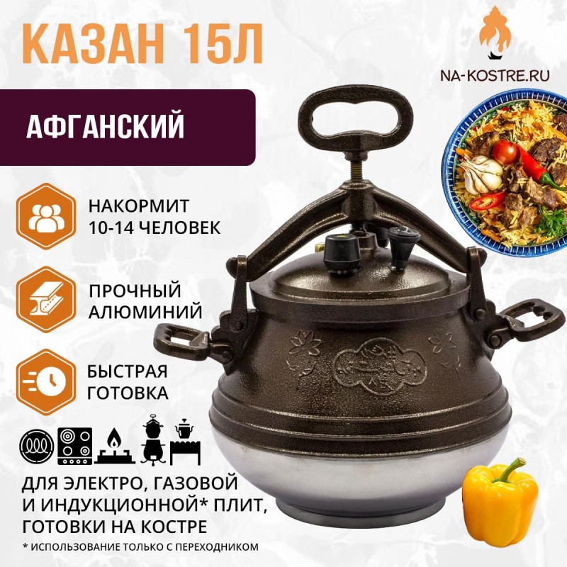 Афганский казан — это походная скороварка из толстого алюминия, позволяющая быстро приготовить вкусную и здоровую пищу. Без крышки его можно использовать как обычную кастрюлю или сковородку. Готовить можно как на природе так и дома. Афганский казан имеет довольно простую конструкцию, которая не подвержена поломкам, что немаловажно в походных условиях.