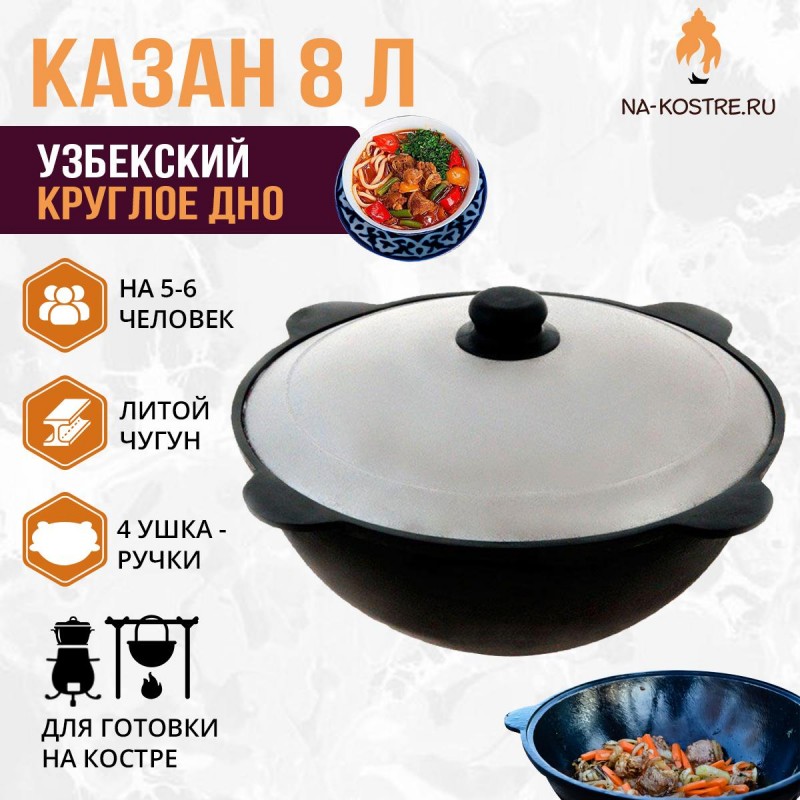 Казан узбекский чугунный 8 л (круглое дно) рассчитан на 5-6 человека. Небольшая компания сможет насладиться едой на костре.