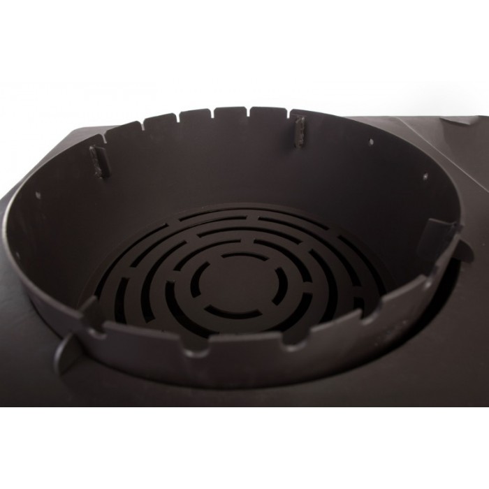 | Аксессуары в комплекте | печь на колёсах, 2 боковых столика, колосник, термометр, вставка-мангал, решетка гриль, кольца под любой диаметр казана, дымоход из нерж.стали |