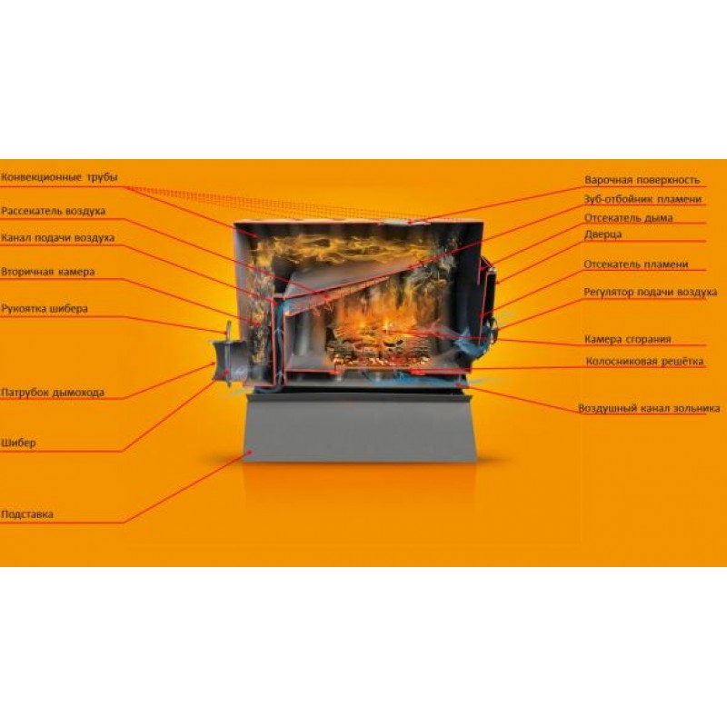 Печь оборудована регулировками горения. В верхней камере сгорания печи установлены дожигатели. Сама печь имеет ручку с низкой теплопроводностью. Печь окрашена термостойкой эмалью и прекрасно впишется в различный интерьер. Быстрый прогрев достигается за счет конвекционных труб которые и формируют непосредственно корпус печи, а так же за счет того что печь изготовлена из стали и ей не требуется много времени для собственного прогрева. Проходя через трубы, воздух нагревается и поднимается вверх.
