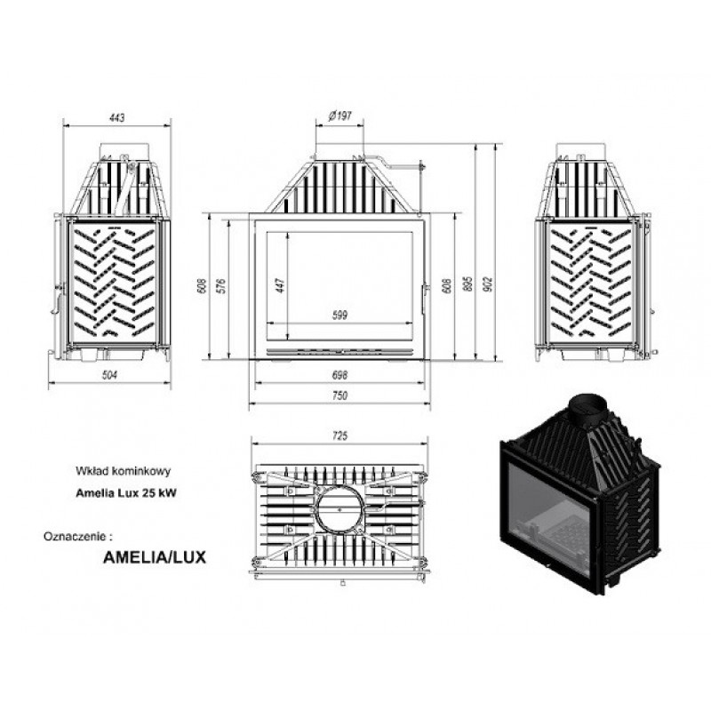Amelia LUX - топочная камера или топка-вкладыш, предназначенная для отопления дома площадью до 250 кв.м. Чугунная топка с широкой дверцей, прямым стеклом и стандартным боковым открытием. Топка имеет высокий дымосборник, большую топочную камеру, по всему корпусу расположены ребра - все это позволяет максимально эффективно использовать тепло, выделяемое при горении топлива. В качестве топлива производитель рекомендует использовать сухие дрова или бурый уголь в брикетах.