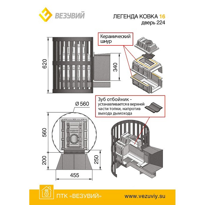 Преимущество печи в том, что топка печи состоит из 3-х элементов. На стыке между ними используется керамический шнур с рабочей температурой 1200 градусов. То есть топка печи абсолютно герметична! Для фиксации деталей между собой применяется болтовое соединение, что даёт 100% гарантию безопасности при эксплуатации.
