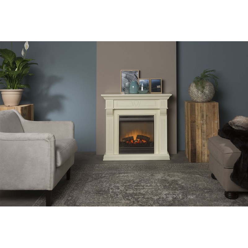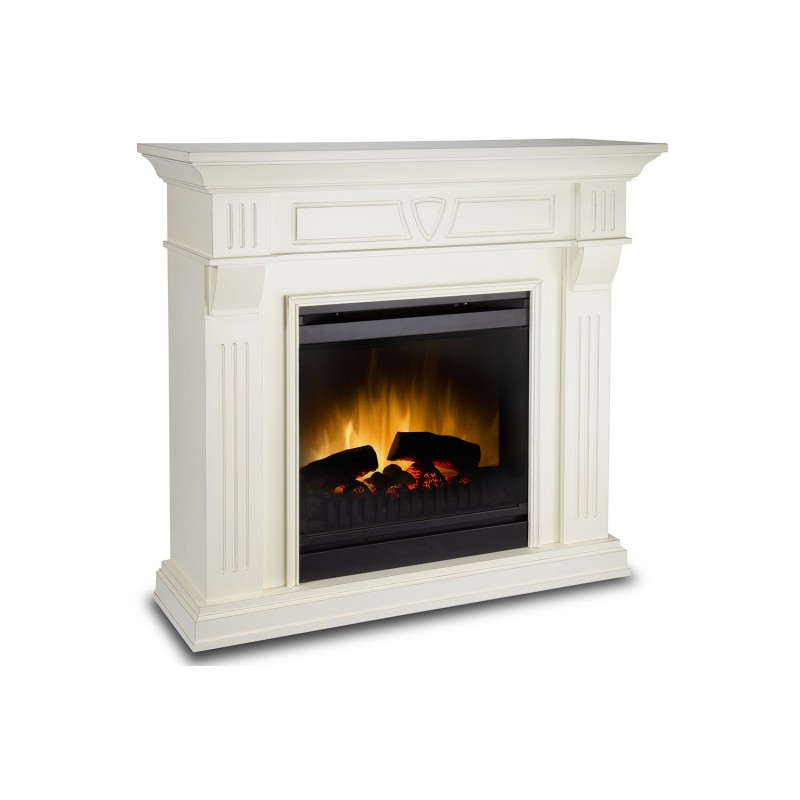 Стильное современное обрамление выполнено в четких прямых линиях, колонны и фронтальная часть портала украшены стильной резьбой. Каминокомплект представлен в единственном цвете «слоновая кость с патиной». Черный широкий очаг с эффектом пламени Optiflame станет ярким акцентом каминокомплекта, а яркое пламя притянет взгляд из любой точки помещения.