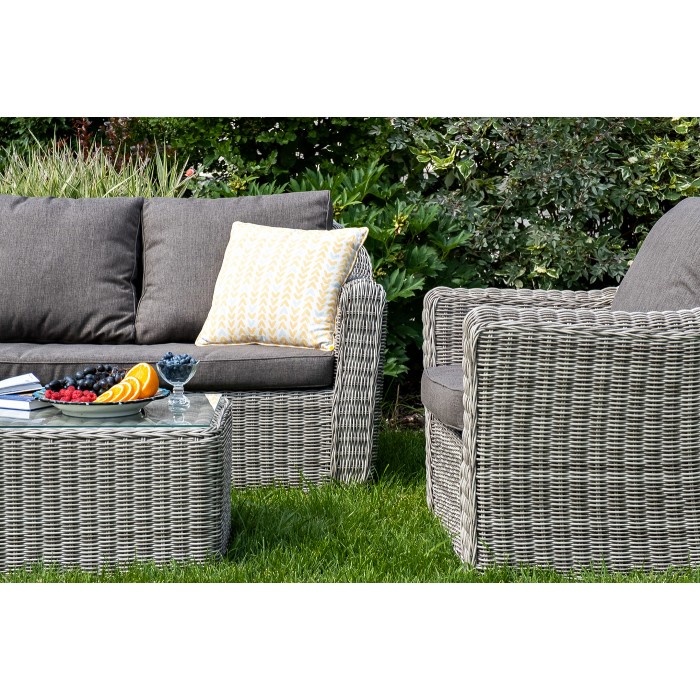 В качестве основы применяется алюминиевый каркас. Из круглого искусственного ротанга сделана ручная оплетка. Цвет комплекта – серый.
