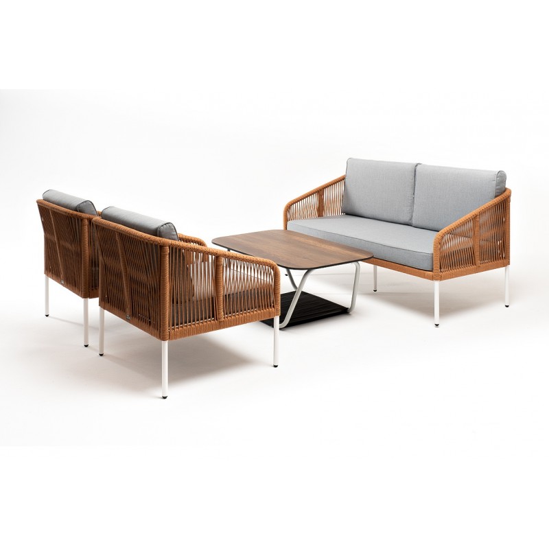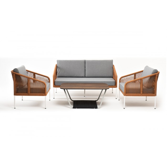 Кресла и диван идут в комплекте с мягкими подушками в чехлах светло-серого цвета. Канны диван 2-местный плетеный из роупа, каркас алюминий светло-серый (RAL7035) шагрень, роуп оранжевый меланж круглый, ткань светло-серая 1шт. 1 500Х700Х750, Канны кресло плетеное из роупа, каркас алюминий светло-серый (RAL7035) шагрень, роуп оранжевый меланж круглый, ткань светло-серая 2шт. 700Х700Х750, Глория журнальный стол 100х65см из HPL, цвет дуб 1шт. 1 000Х650Х420,