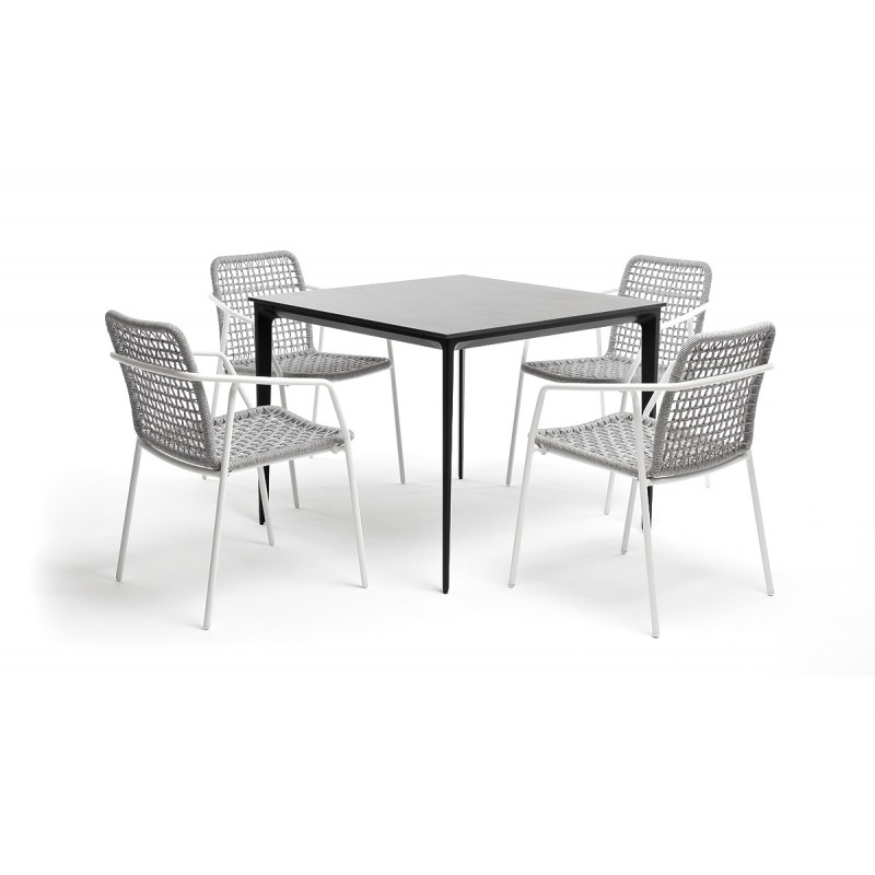 Малага обеденный стол из HPL 90х90см, цвет серый гранит , каркас черный 1шт. 900Х900Х750, Тунис стул плетенный из роупа, каркас алюминий белый, роуп светло-серый 4шт. 575Х600Х800,