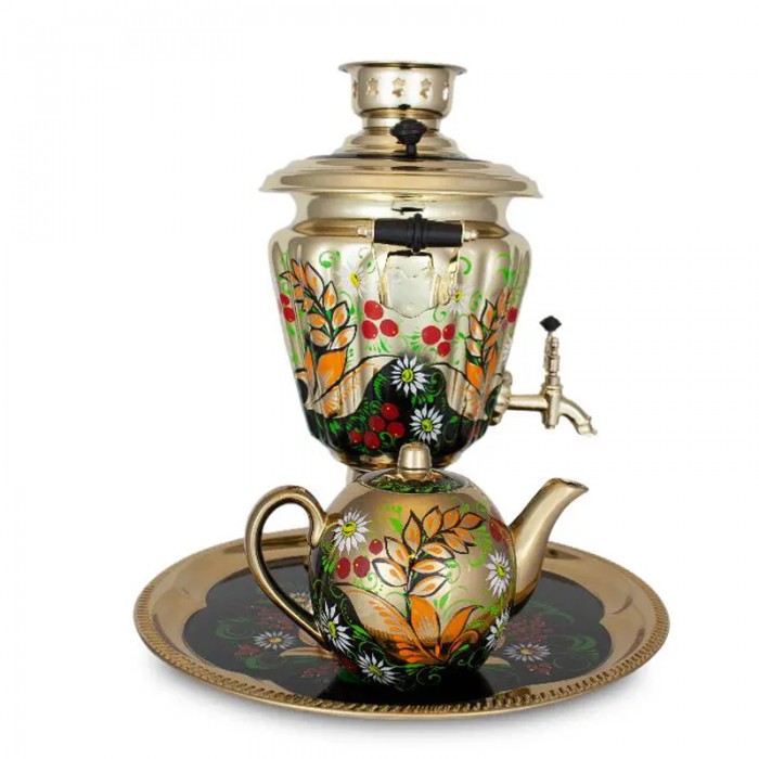 Ромашки на золотом - это современное выражение традиционного растительного орнамента. Художники объединили мотивы характерные для хохломы и жостово, добавили новые цветовые решения, золотой и черный фоны и создали новый и одновременно традиционный узор «Ромашки на золотом». И самовар, и поднос, и чайник выполнены в единой росписи.