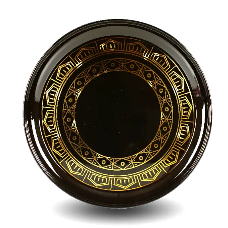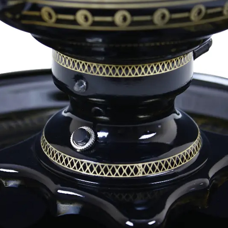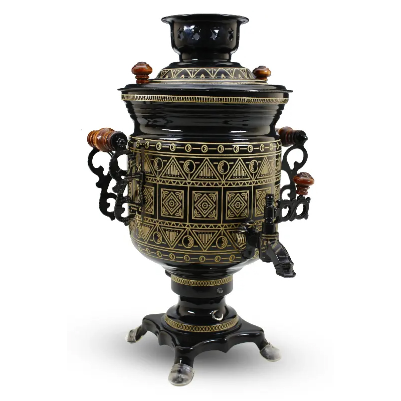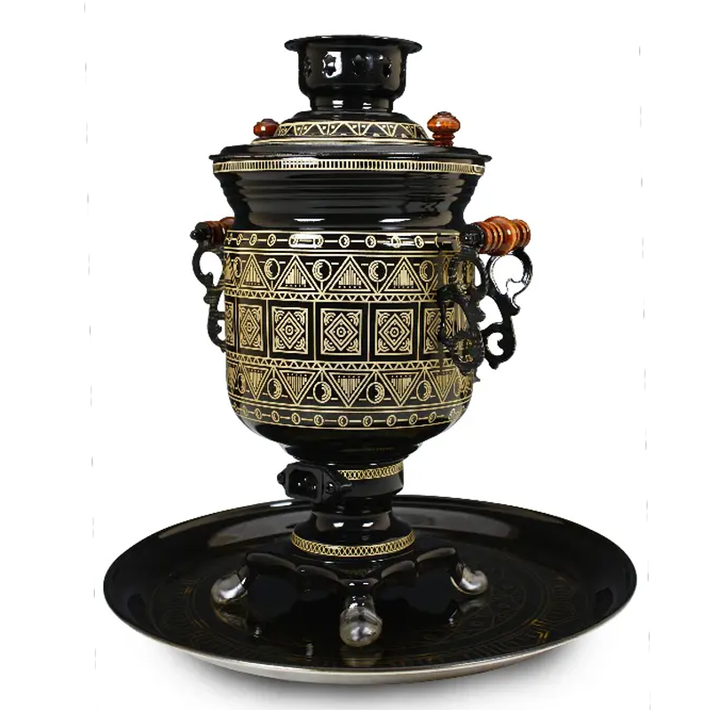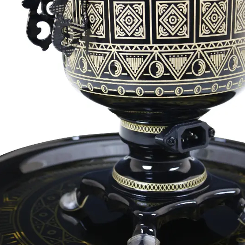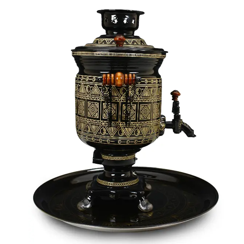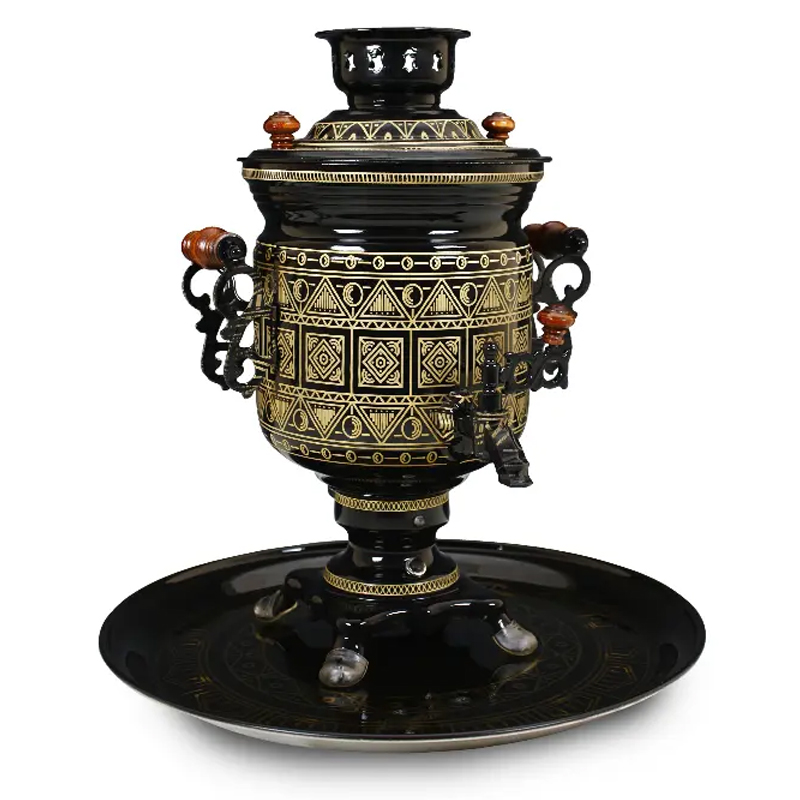 Роспись повторяет узор аналогичного самовара на дровах, который выпускался в советское время на заводе Штамп. Наши мастера решили восстановить народный рисунок с помощью современных технологий - рисунок выполнен автоматической гравировкой и закрыт специальным лаком. За счет этого создается контраст и насыщенность при минимуме цветов. В наборе также идет поднос, выполненный в едином стиле с самоваром.