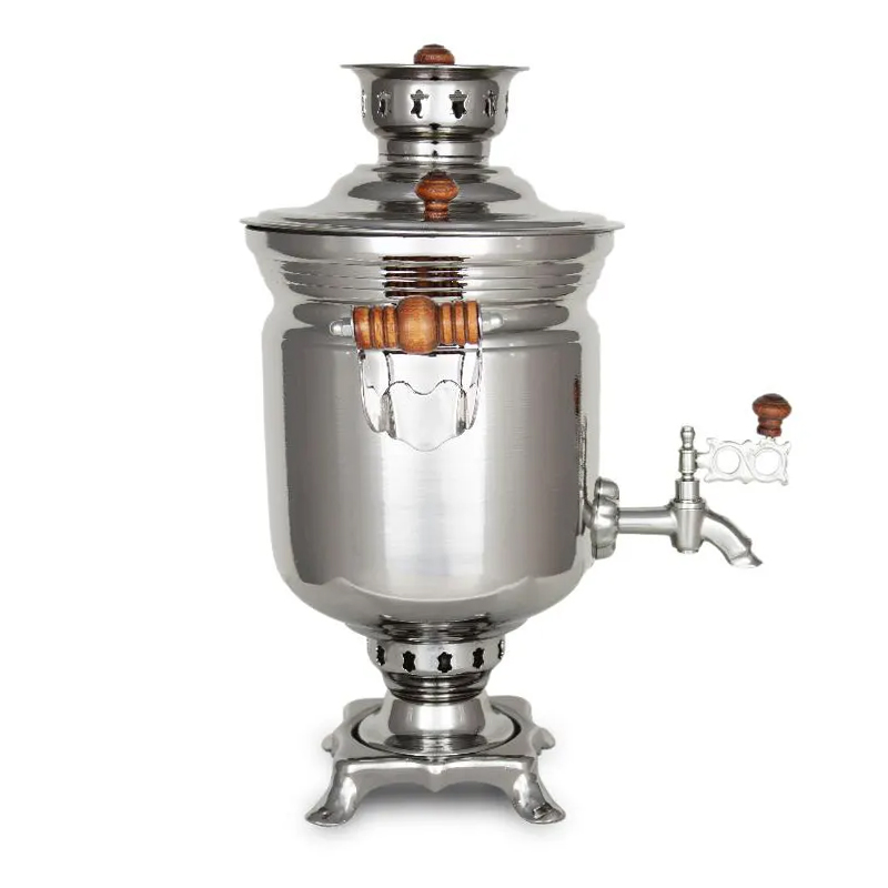 Это все тот же материал - латунь Л63, но покрыт специальным никелированным составом. За счет этого достигается идеальная зеркальная поверхность. Но преимущества никелированного покрытия не только в визуальной части. Оно защищает самовар от механических воздействий - сколов и царапин. К тому же, для такого самовара не нужны дополнительные чистящие средства, его достаточно просто протереть сухой тканью, например, микрофиброй.