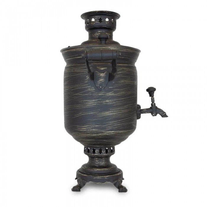 Декор «Кракелюр» напоминает золотые нити, которым окутан самовар. Конечно же такой контраст придает акцент внешнему виду. Пусть вас не удивляет, но это все та же латунь. Будет отлично смотреться практически в любом месте..