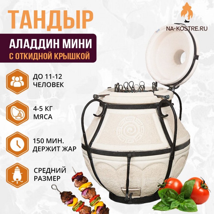 | Аксессуары в комплекте | подставка под тандыр, подставка-стойка, шампуры 12 шт, этажерка 3-ярусная большая, солнышко, чехол, перчатки термостойкие, совок, кочерга, крюк кованый для мяса |