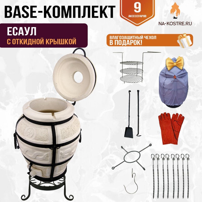 Аксессуары в комплекте | подставка под тандыр, шампуры 8 шт, этажерка 3-ярусная средняя, солнышко, чехол, перчатки термостойкие, совок, кочерга, крюк кованый для мяса |