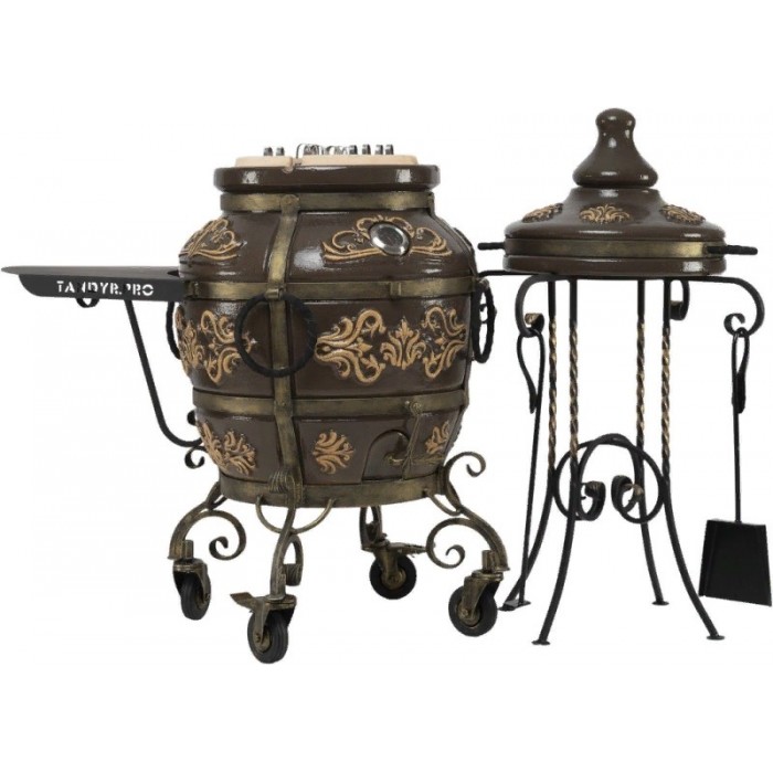 Все самое лучшее воплощено в тандыре "Гранд". Тандыр покрыт глянцевой глазурью. Ручки из натуральной кожи. Сам корпус тандыра сделан в классической форме кувшина, при этом горловина тандыра "Гранд" достигает внушительных 30 см. Большая крышка тандыра имеет удобную подставку. В толстостенном корпусе тандыра установлен большой наглядный термометр, и у хозяев этого тандыра никогда не будет сомнений относительно правильной температуры приготовления многочисленных блюд. Четыре ручки на корпусе для переноски тандыра тоже подчеркивают уверенность и основательность тандыра "Гранд". В комплекте 16 шампуров со специальными зажимами, для того чтобы обладатель тандыра всегда имел возможность готовить много и вкусно.