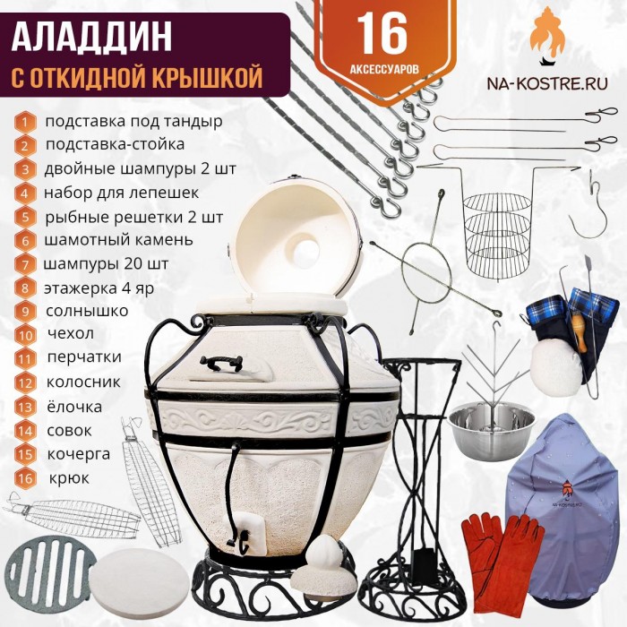 | Аксессуары в комплекте | подставка под тандыр, подставка-стойка, двойные шампуры 2 шт, набор для приготовления лепешек, рыбные решетки - 2 шт, шамотный камень d28 см, шампуры 20 шт, этажерка 4-ярусная большая, солнышко, чехол, перчатки термостойкие, ёлочка d28 см, совок, кочерга, крюк кованый для мяса |