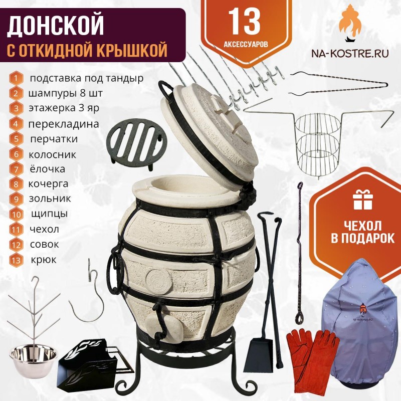 Выгодное VIP-предложение с большим кол-вом самых ходовых аксессуаров для использования всех преимуществ приготовления еды в тандыре на любой случай: будь то семейный ужин или приготовление праздничного обеда на большое кол-во гостей. Особенностью данной модели является установленный прочный механизм с откидной крышкой.