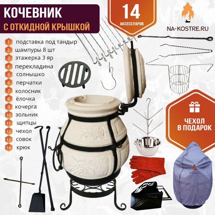 | Аксессуары в комплекте | подставка под тандыр, шампуры 8 шт, этажерка 3-ярусная, перекладина, солнышко, чехол, перчатки термостойкие, ёлочка, зольник, щипцы, совок, кочерга, крюк кованый для мяса |
