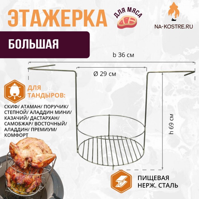 Этажерка мясная средняя 29 см— подходит для размещения на ней различной посуды (чугунок, тажин, курница, солило, керамических горшочков, сковородок и поддонов). Также на ней можно запекать крупные куски мяса и птицы, или поставить керамический поддон для сбора сока, капающего с мяса, которое будет подвешено на крюке на универсальной перекладине или «солнышке». Таким образом вы можете приготовить одновременно главное блюдо и гарнир в собственном соку.