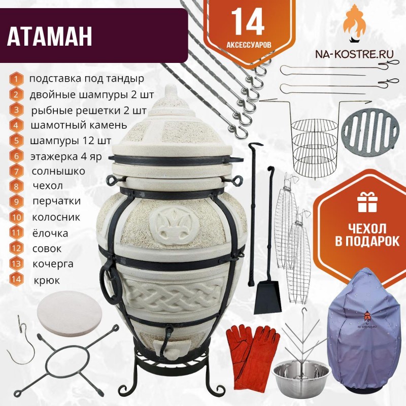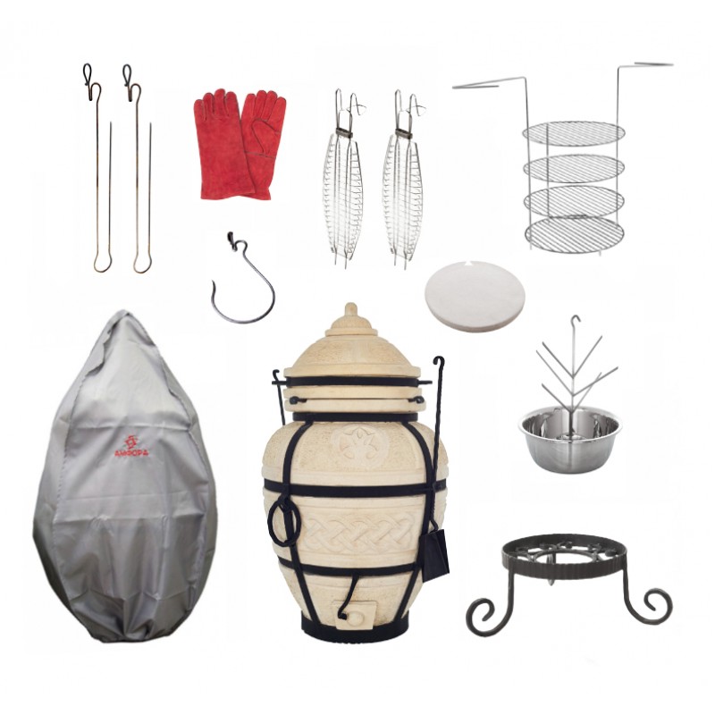 | Аксессуары в комплекте | подставка под тандыр, двойные шампуры 2 шт, рыбные решетки - 2 шт, шамотный камень d28 см, шампуры 12 шт, этажерка 4-ярусная большая, солнышко, чехол, перчатки термостойкие, ёлочка d28 см, совок, кочерга, крюк кованый для мяса |