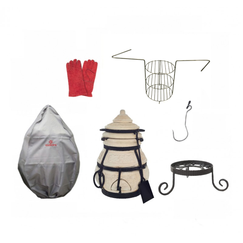 | Аксессуары в комплекте | подставка под тандыр, шампуры 8 шт, этажерка 3-ярусная, солнышко, чехол, перчатки термостойкие, совок, кочерга, крюк кованый для мяса |