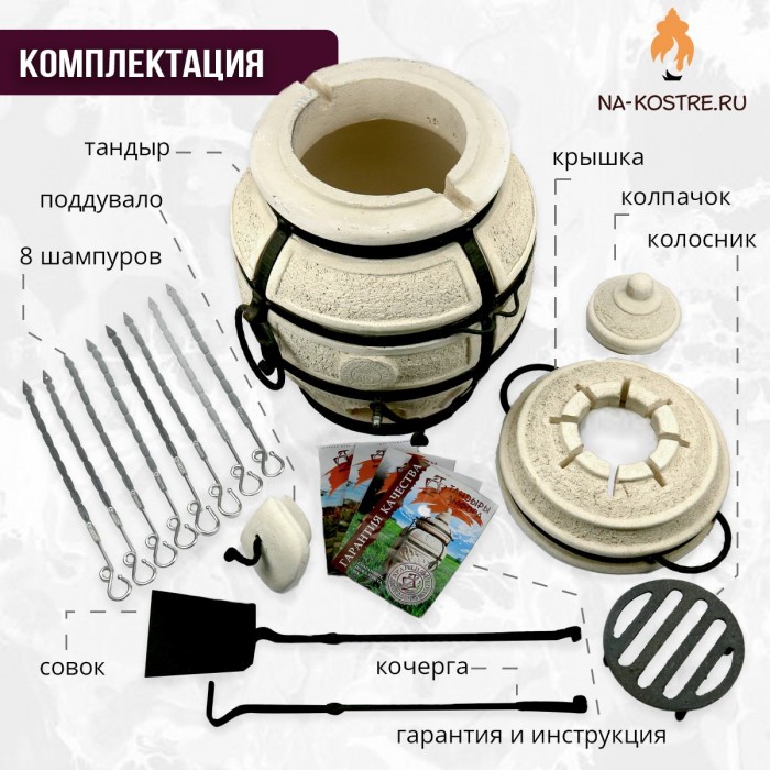 | Аксессуары в комплекте | подставка под тандыр, набор для приготовления лепешек, подставка под казан высокая, подставка под крышку, коробочка для копчения, решетка для стейков 21 см, перчатки термостойкие, кочерга, зольник, ёлочка, шумовка 46 см, чехол, совок, пирометр, щипцы кованые, этажерка 3-ярусная, казан 8л, шампуры 8 шт, перекладина, солнышко, крюк кованый для мяса |