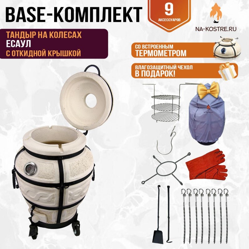 Аксессуары в комплекте | подставка под тандыр, шампуры 8 шт, этажерка 3-ярусная средняя, солнышко, чехол, перчатки термостойкие, совок, кочерга, крюк кованый для мяса |