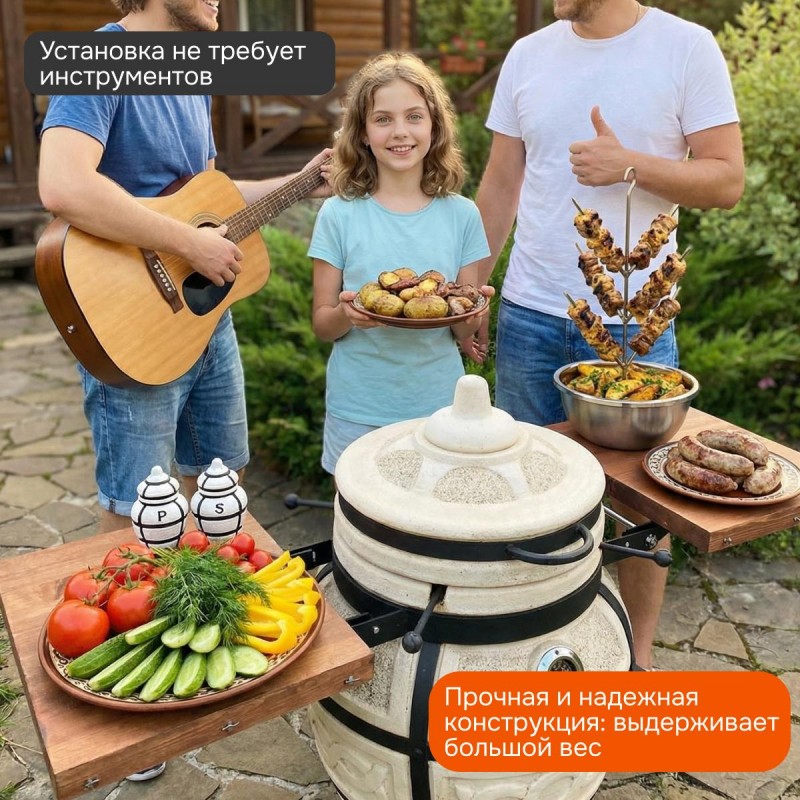 | Аксессуары в комплекте | подставка под тандыр, шампуры 8 шт, этажерка 3-ярусная средняя, солнышко, чехол, перчатки термостойкие, совок, кочерга, крюк кованый для мяса |