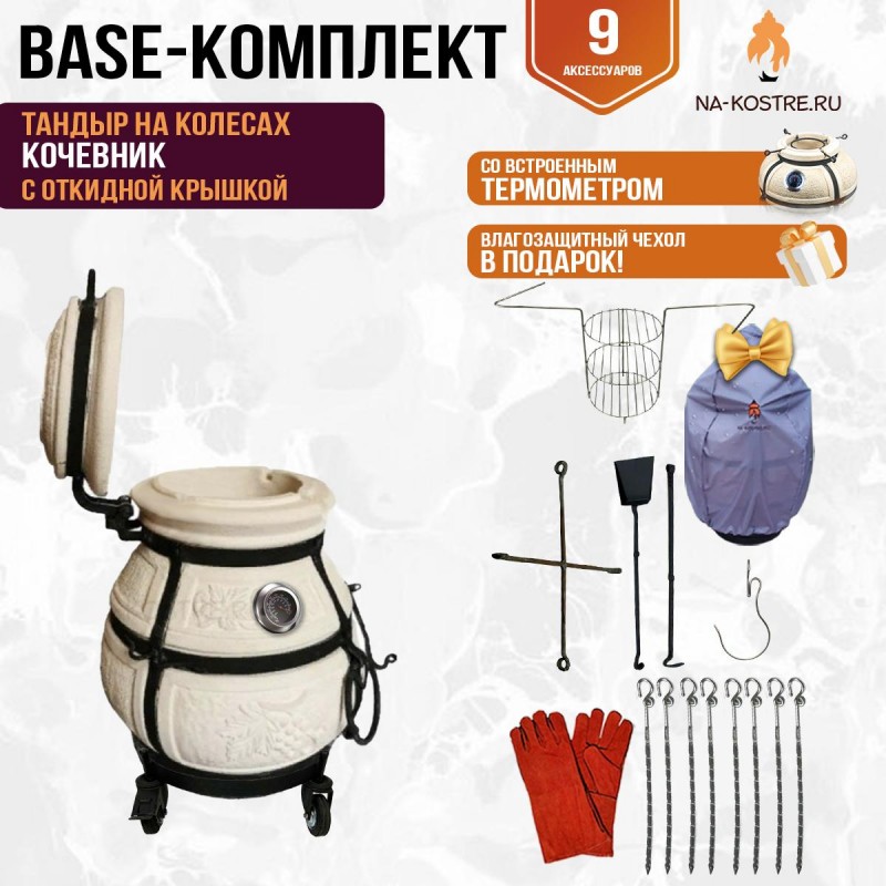 Аксессуары в комплекте | подставка под тандыр, шампуры 8 шт, этажерка 3-ярусная, солнышко, чехол, перчатки термостойкие, совок, кочерга, крюк кованый для мяса |