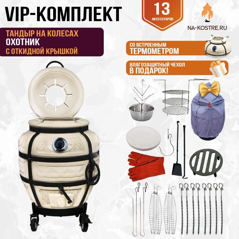 Выгодное VIP-предложение с большим кол-вом самых ходовых аксессуаров для использования всех преимуществ приготовления еды в тандыре на любой случай: будь то семейный ужин или приготовление праздничного обеда на большое кол-во гостей. Особенностью данной модели является установленный прочный механизм с откидной крышкой.