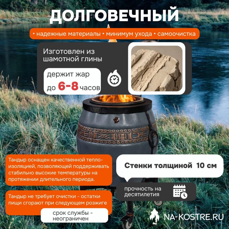 За счет особенностей конструкции и использования шамотной глины, тандыр нагревается в кратчайшие сроки, что позволяет сэкономить время на приготовлении блюд.